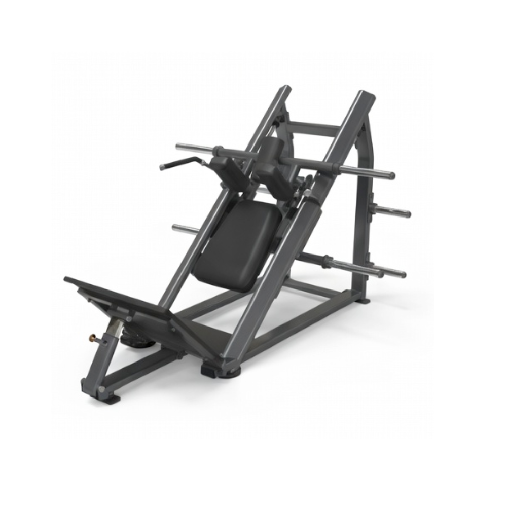 Hack squat toestel met plate loaded systeem voor gerichte beentraining. Biedt stabiliteit, comfort en geschikt voor intensief gebruik.