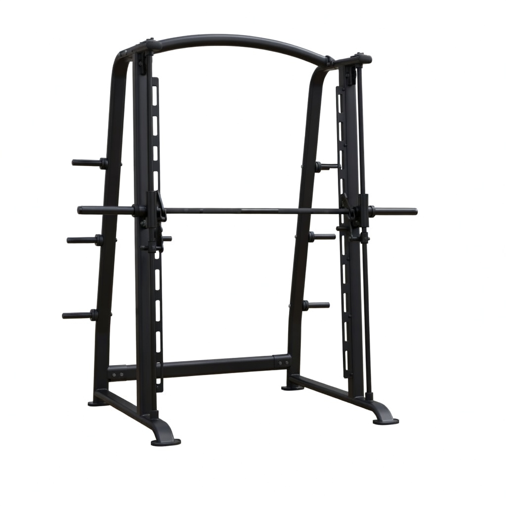 De Gymfit Smith Machine is een krachtstation met een geleide halterrail voor gecontroleerde oefeningen. Het apparaat ondersteunt squats, bench presses, lunges en andere halteroefeningen. De halterrail heeft verstelbare safety stops voor extra veiligheid. De constructie is gemaakt van stevig staal en is geschikt voor intensief gebruik. De machine heeft houders voor halterschijven om de ruimte overzichtelijk te houden. De hoogte en positie van de halter kunnen worden aangepast aan verschillende gebruikers. Het ontwerp maakt het mogelijk om zowel boven- als onderlichaam effectief te trainen.