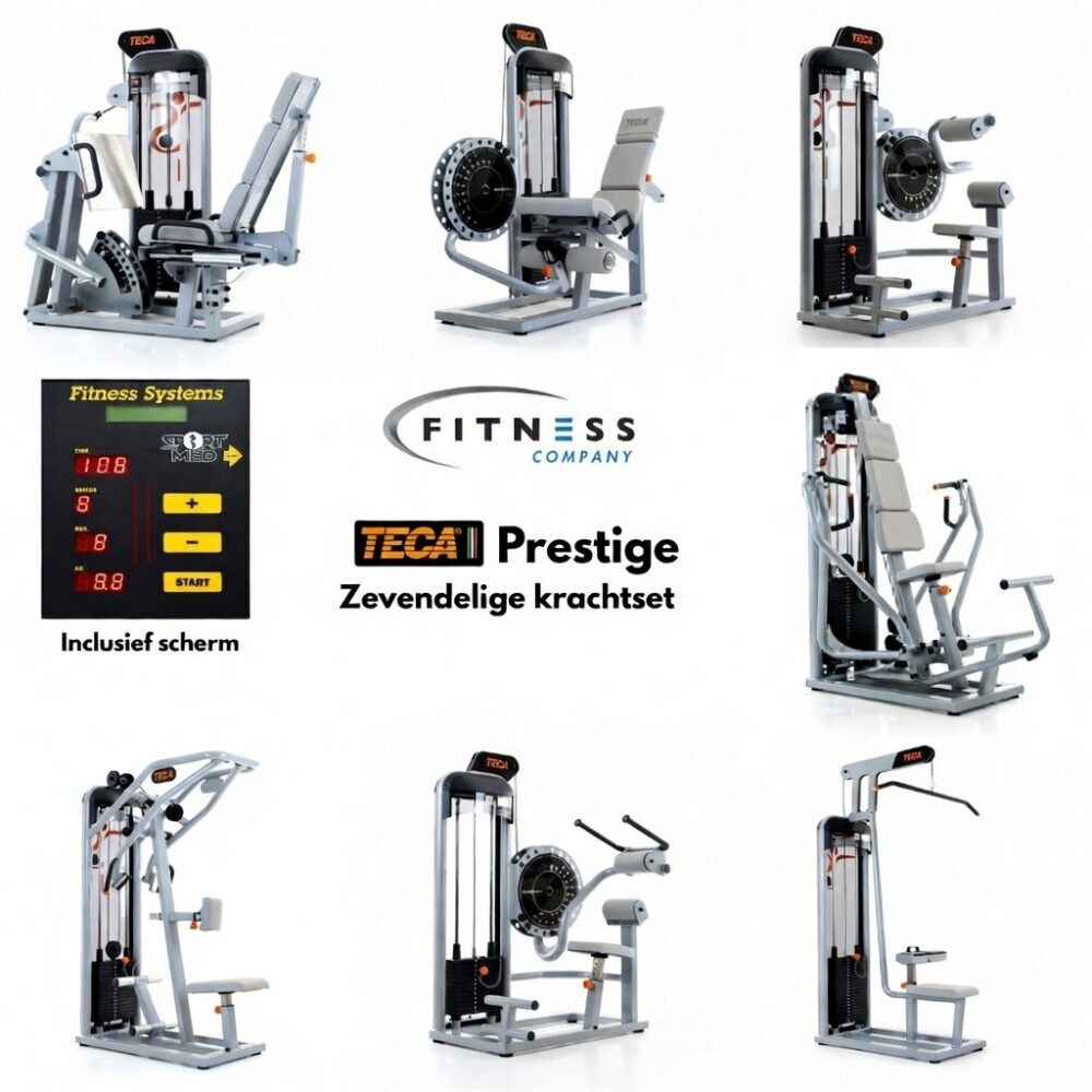 Deze Prestige set toont nogmaals aan waarom Teca zo’n goede reputatie heeft binnen de fitnessbranche. Het merk stamt uit Italië en toont dat ook in zijn kwaliteit en ontwerp. Teca focust namelijk op de biomechanica en prioriseert gebruikersveiligheid. Deze krachtset bestaat uit zeven apparaten waarmee veel spieren mee getraind kunnen worden. Ideaal voor sporters die een effectieve en kwalitatieve set zoeken. De apparaten zijn uitgerust met ‘Fitness Systems – Sport Med’ schermen. Hierop worden gegevens met betrekking tot de oefening weergeven.